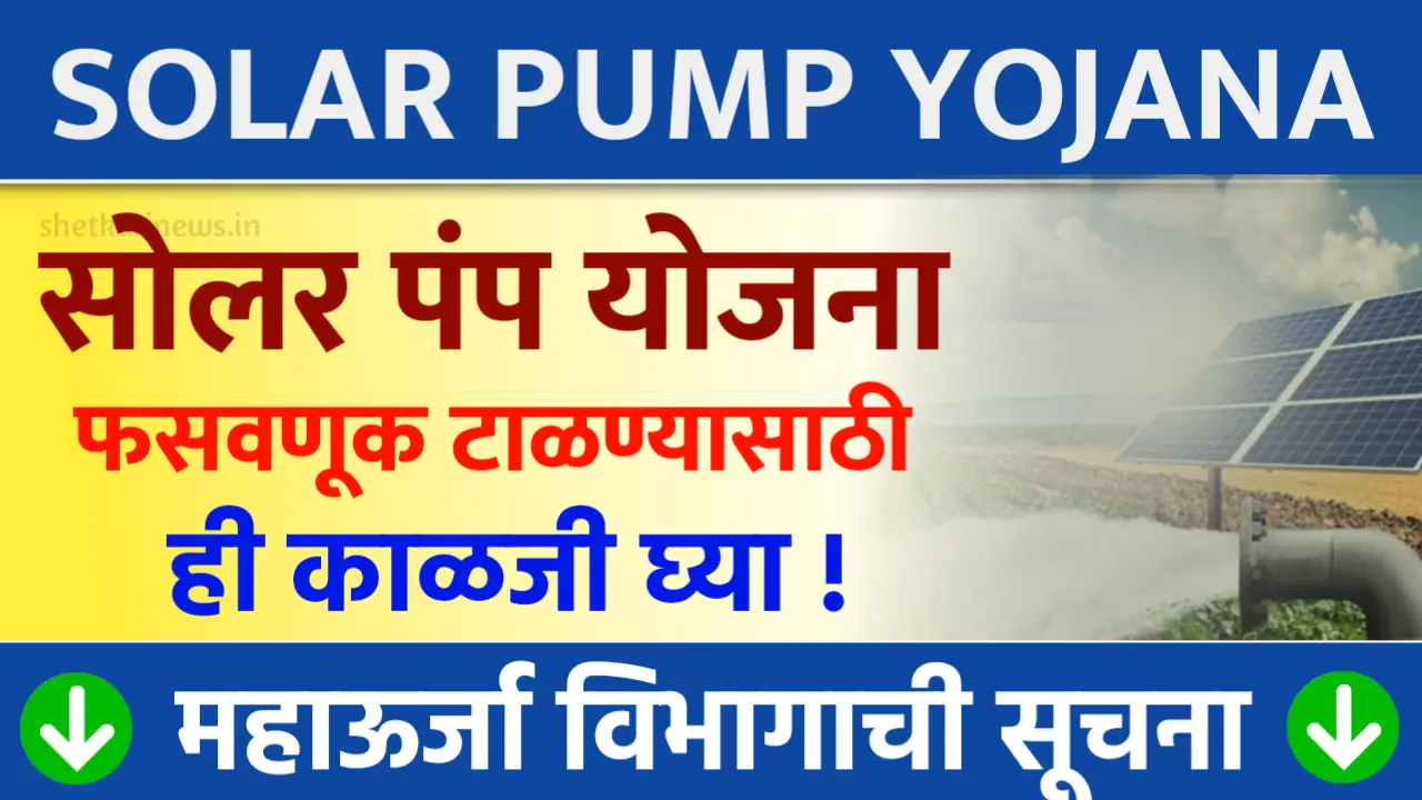 Solar Pump Yojana : गेल्या दोन वर्षापासून राज्यातील शेतकऱ्यांना कृषी पंपासाठी दिवसा वीज पुरवठा उपलब्ध व्हावा, या अनुषंगाने शेतकरी महाऊर्जा संकेतस्थळावर कुसुम सोलर पंप योजनेसाठी ऑनलाईन अर्ज मागविण्यात येत आहेत. नुकतीच मागेल त्याला सौर कृषी पंप योजनेची अधिकृत वेबसाईटसुद्धा शासनाकडून सुरू करण्यात आलेली आहे. परंतु काही बनावट संकेतस्थळाद्वारे किंवा एसएमएसच्या शेतकऱ्यांची दिशाभूल करून त्यांची आर्थिक फसवणूक केली जात आहे.